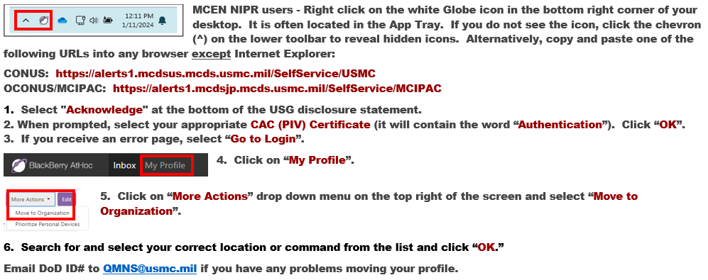 Quantico Marine Corps Enterprise Network (MCEN) NIPR users - copy & paste the following self-service URL into any browser, besides Internet Explorer (Hover your mouse curser over the globe to determine assigned organization if you are unsure), Then follow the remaining steps to register for or update your QMNS Profile.