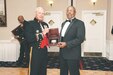 August 28, 2014 — Retired staff sergeant and Montford Point Marine Johnny Cody received the Congressional Gold Medal to highlight Saturday night’s annual gala by the Quantico chapter of the National Montford Point Marine Association. Lt. Gen. Kenneth J. Glueck Jr., commanding general of the Marine Corps Combat Development Command and deputy commandant, Combat MORE